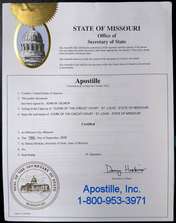 State of Missouri Apostille Example: